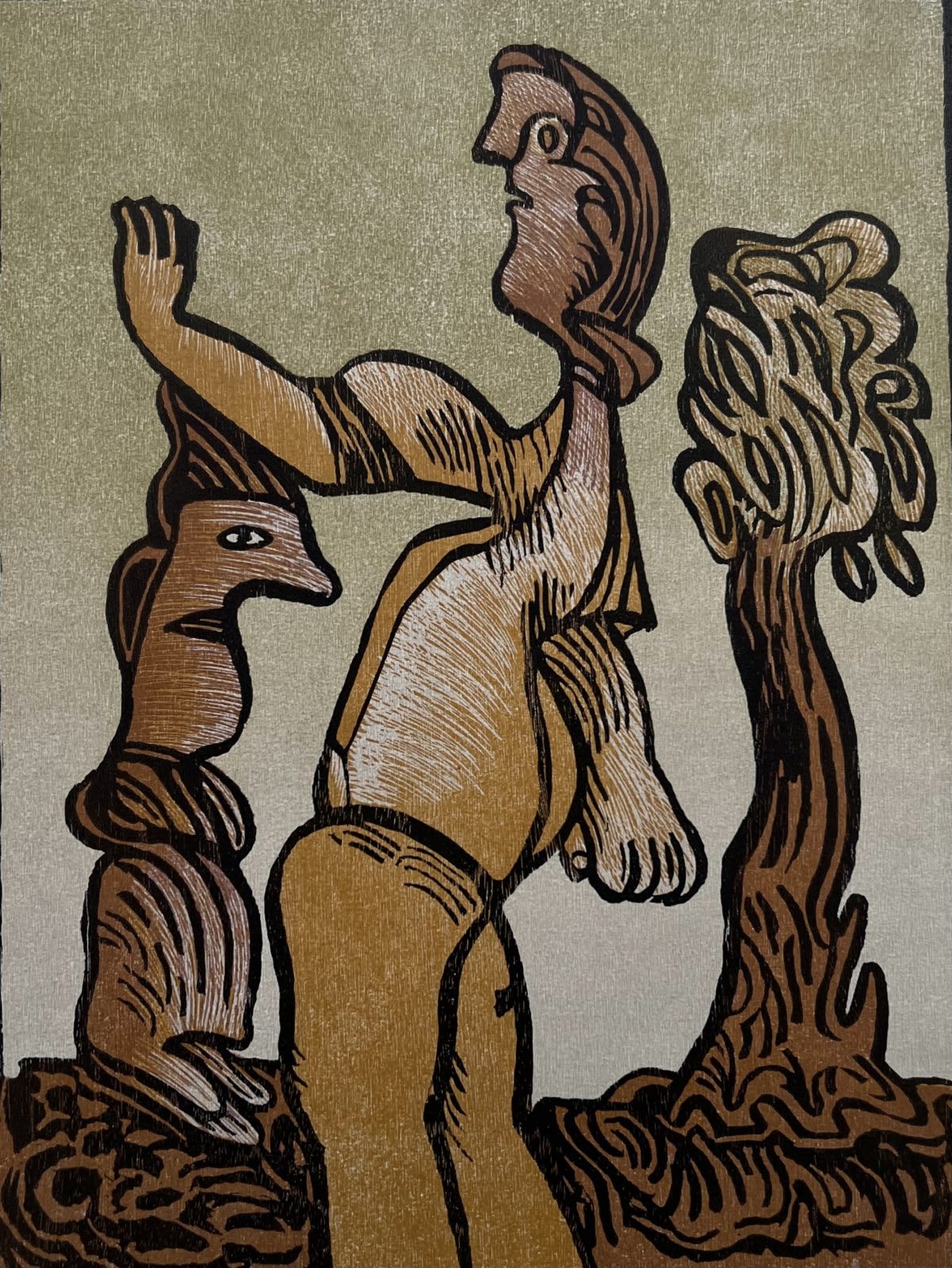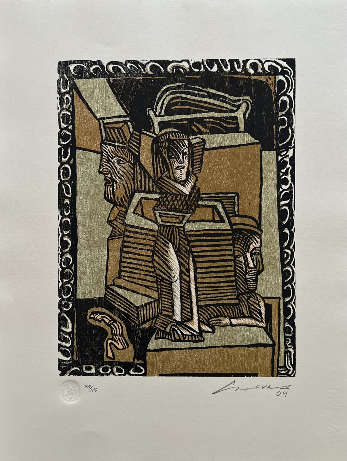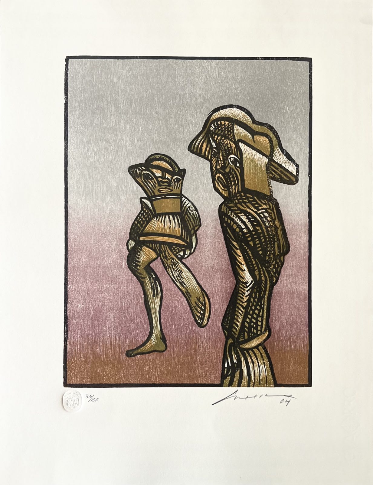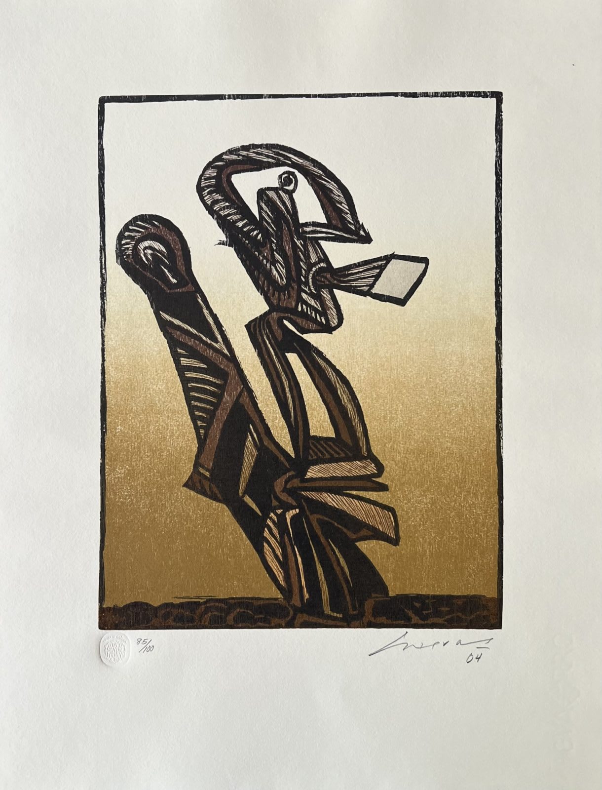 Es un grabado muy interesante, con rasgos figurativos y abstractos. Da la impresión de ser collage y es únicamente grabado.