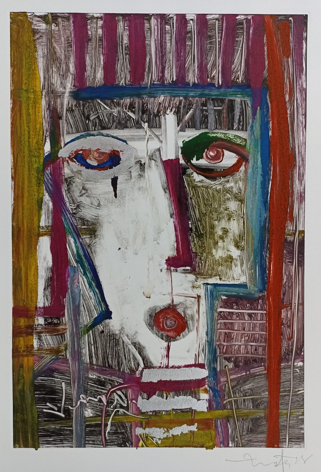 Es un grabado muy interesante, con rasgos figurativos y abstractos. Da la impresión de ser collage y es únicamente grabado.