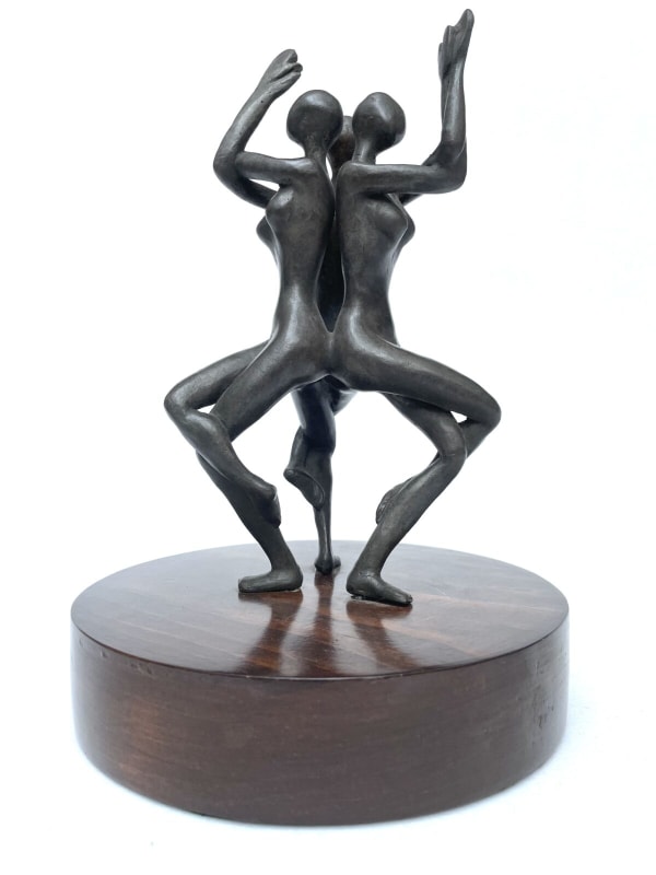 La escultura está sobre una base de madera de 22.5 cm de diámetro por 5 cm de altura. En esta pieza se percibe equilibrio, colaboración, paz.