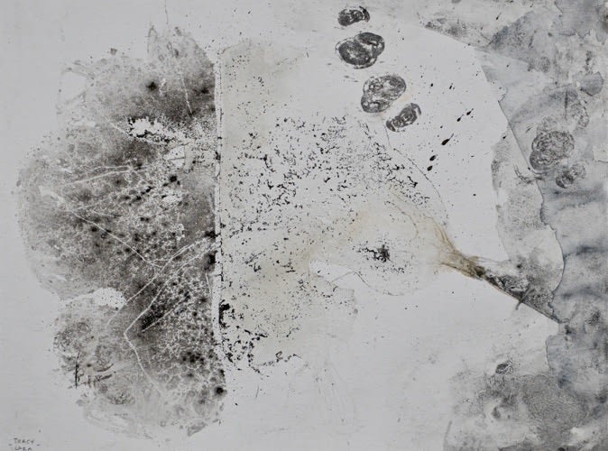 Huellas orgánicas, gama tonal que va del blanco al negro, entretejida con la discreta presencia del amarillo.